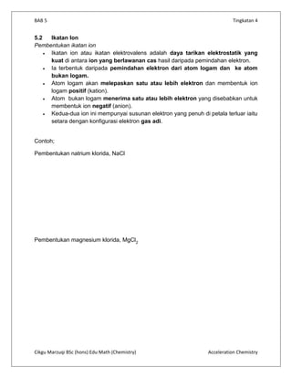 Dokumen ini menerangkan tentang ikatan kimia, pembentukan sebatian, dan jenis-jenis ikatan seperti ikatan ion dan kovalen. Sebatian terbentuk melalui gabungan unsur, manakala ikatan ion melibatkan pemindahan elektron, dan ikatan kovalen melalui perkongsian elektron. Sifat sebatian dipengaruhi oleh jenis ikatan yang membentuknya, dengan sebatian ion biasanya pepejal dengan takat lebur dan didih yang tinggi, sementara sebatian kovalen sering wujud dalam bentuk cecair atau gas dengan takat lebur dan didih yang rendah.