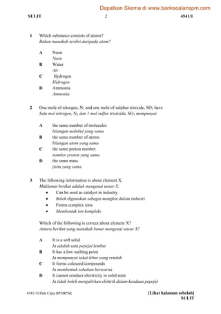 This document contains a chemistry exam paper from the Malaysian Ministry of Education. The exam paper consists of 31 pages and covers various chemistry concepts tested over 1 hour and 15 minutes. Students are instructed to only open the paper when told to and that the questions are presented in both English and Malay languages side by side.