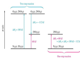 Hess's law states that the enthalpy change of a reaction is independent of the pathway taken, as enthalpy is a state function. Using Hess's law, the enthalpy change of a reaction can be calculated by adding together enthalpy changes of multiple steps that combine to give the overall reaction. This is demonstrated with examples calculating the enthalpy change of reactions by combining known reaction enthalpies. Reactions can be reversed and coefficients adjusted as needed to achieve the desired overall reaction.