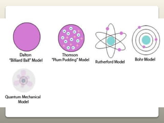 Dokumen ini membahas perkembangan model atom dari Dalton hingga model modern, dimulai dari model atom Dalton yang menganggap atom sebagai bola pejal, model Thomson yang melihat atom sebagai bola bermuatan positif dengan elektron bermuatan negatif tersebar di dalamnya, model Rutherford yang memperkenalkan konsep inti atom dan elektron mengelilinginya, model Bohr dengan konsep elektron mengorbit inti pada tingkat energi tertentu, hingga model modern berdasarkan mekanika kuantum