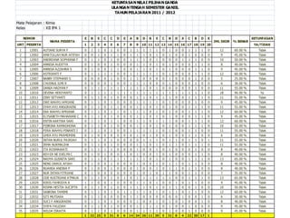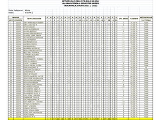 This document contains a summary of multiple choice test results for chemistry from the first semester of the 2011/2012 school year. It lists the names and test scores of 35 students in Class XII IPA 1 and 14 students in Class XII IPA 2, along with the percentage of correct answers and whether each student passed or failed. Most students scored between 30-65% and are listed as failing the exam. One student from Class XII IPA 1, Devina Heriyanto, scored 90% and is listed as passing.