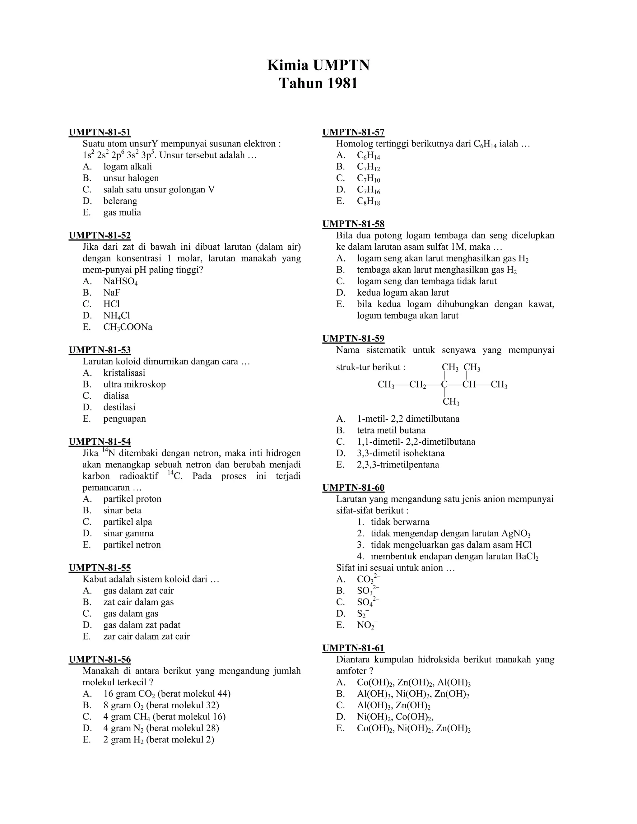 Dokumen ini berisi soal-soal ujian nasional di bidang kimia dari tahun 1981, mencakup berbagai topik seperti struktur atom, sifat-sifat senyawa, reaksi kimia, dan konsep dasar termodinamika. Setiap soal disertai dengan pilihan jawaban dan membahas aspek-aspek penting dari kimia seperti pH, larutan, dan ikatan antar molekul. Dokumen ini merupakan sumber penting untuk mempersiapkan ujian memasuki perguruan tinggi.