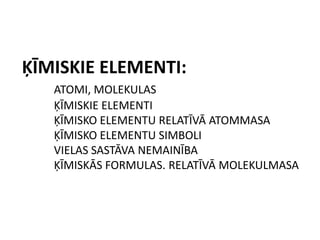 Ķīmiskie elementi: atomi,molekulasĶīmiskie elementiķīmisko elementu relatīvā atommasaķīmisko elementu simboli vielas sastāva nemainībaķīmiskās formulas. Relatīvā molekulmasa