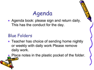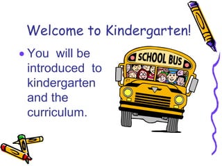 This document provides information for parents about the kindergarten curriculum and schedule at a school. It summarizes the daily schedule, classes like reading and math workshops, assessments, and school procedures. Parents are given details about attendance, check-ins/outs, communication folders, lunches, birthdays, and the opportunity to volunteer. The goal is to prepare parents and students for what to expect in kindergarten.