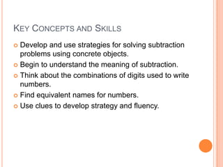 The document outlines a kindergarten subtraction unit focusing on strategies for solving subtraction problems using concrete objects and understanding the concepts of subtraction. It introduces subtraction and equal signs, provides practice activities and games, and includes resources for further practice. Common core standards are referenced along with recommended materials for teaching.