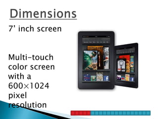The Amazon tablet retails for $199, features a 7-inch multi-touch screen with 600x1024 pixel resolution, includes 8GB storage and comes preloaded with apps, movies and books. It has up to 8 hours of battery life, runs the Android 2.3 Gingerbread OS on a 1Ghz dual-core processor and connects via Wi-Fi but not 3G. The tablet allows access to Amazon's digital content including millions of books, songs and apps through its web-storage platform.