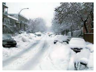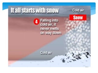 The document discusses the main types of precipitation: rain, snow, sleet, and hail. Rain falls as liquid when temperatures are above 0°C and is the most common type. Snow forms from ice crystals when temperatures are cold enough to freeze water vapor directly into ice. Sleet consists of frozen rain droplets that form when rain passes through a layer of freezing air. Hail develops when rain freezes into balls or chunks of ice that accumulate additional layers of ice and vapor as they are pushed between cold and warm air currents.
