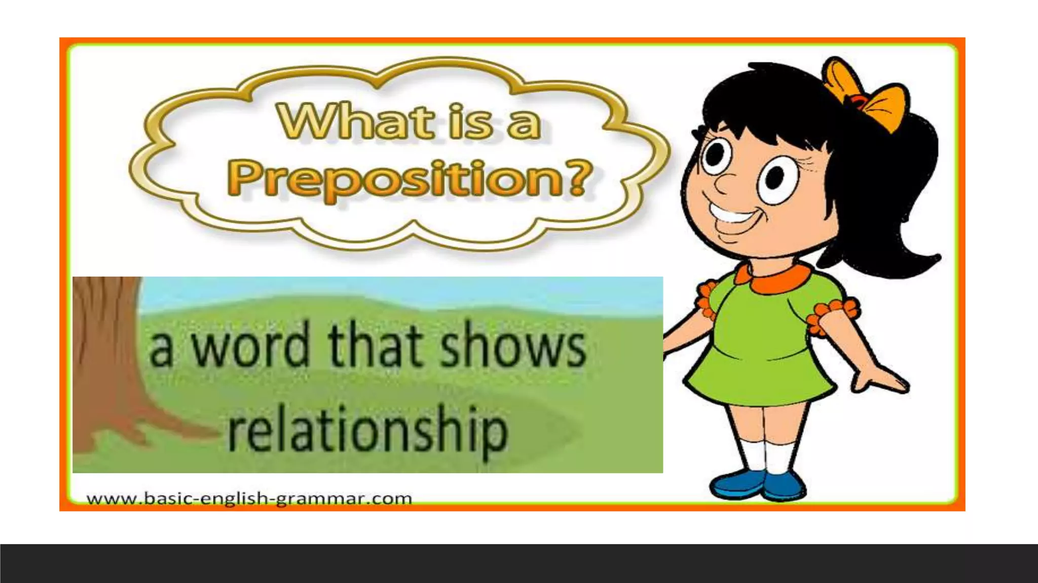 This document discusses prepositions and provides examples of different types. It defines prepositions of time, place, movement/direction, agent, and relation. Examples are given of prepositions of place and relation to illustrate the different kinds.