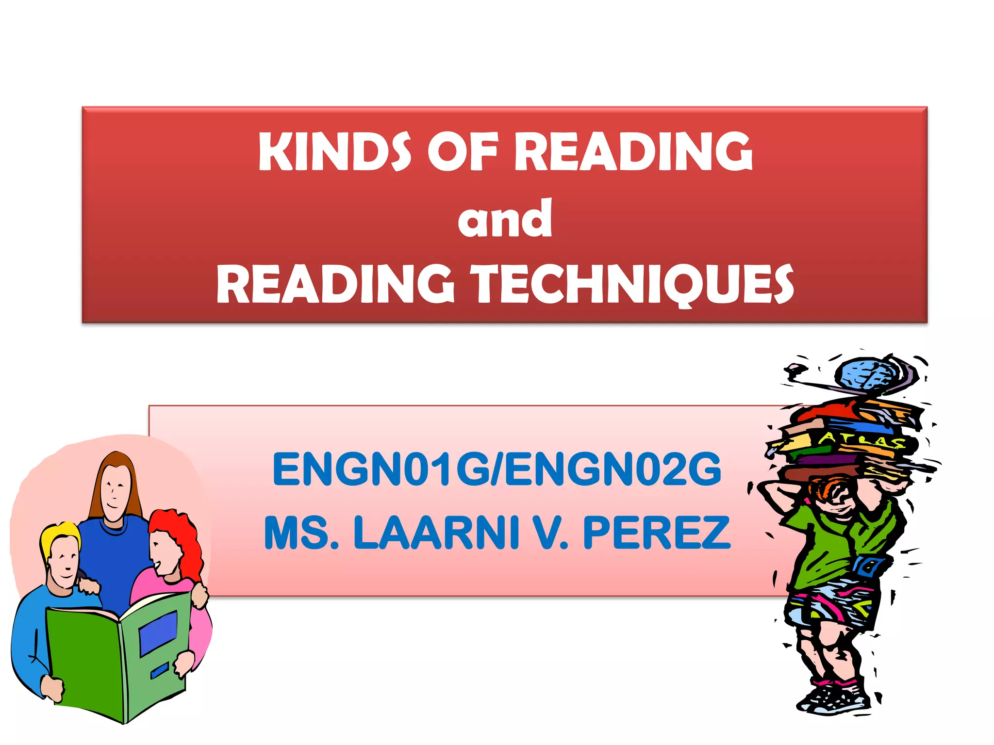 This document discusses different kinds and techniques of reading. There are two main kinds - extensive reading which is casual reading for pleasure, and intensive reading which requires careful analysis of details. Intensive reading has several subtypes including scanning to quickly locate information, skimming to get the main ideas, exploratory reading to understand a whole text, study reading using techniques like SQ3R to maximize understanding, critical reading to evaluate facts and opinions, and analytical reading to carefully analyze individual words. The document provides examples and steps for several reading techniques.