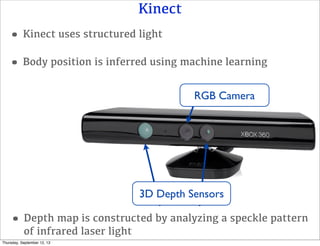 The document summarizes a tutorial presentation about the Kinect and its 3D depth sensing capabilities. It describes how the Kinect uses structured light and machine learning to construct depth maps and infer body position from depth images. It also provides an overview of the OpenNI and NITE libraries for accessing Kinect sensor data and the types of data that can be accessed like RGB images, depth maps, and skeletal joint positions.