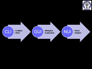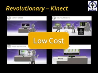 The document discusses Natural User Interfaces (NUIs) and how they revolutionize human-computer interaction by interpreting natural human communication through touch, gesture, voice, and eye gaze. It focuses on the Kinect sensor's hardware and software capabilities for tracking, gesture recognition, and interaction, including details about its API and middleware libraries. Additionally, it provides examples of applications leveraging Kinect, such as virtual fitting rooms and performance evaluation in dance using skeleton tracking.