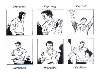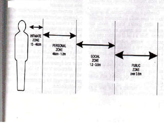 The document discusses kinesics, the scientific study of body language and non-verbal communication. It covers topics like gestures, facial expressions, personal space zones, body posture, appearance, and how body language varies between cultures. Key points are that body language provides important context for verbal messages, and most movements are unconsciously learned and have culturally dependent meanings.