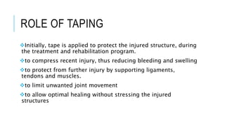Kinesio taping is a therapeutic taping method that uses elastic tape to enhance muscular, joint, and circulatory functions. It can be applied for up to 3-5 days. The tape is designed to lift the skin slightly and provide support without restricting movement. Taping can be used to relieve pain, improve joint stability, prevent injury, and correct biomechanics. Different taping techniques are used for specific purposes like lymphatic drainage, pain relief, and positional correction. Proper assessment, skin preparation, and tape application technique are important for effective results. Kinesio taping is intended to complement treatment and rehabilitation rather than replace it.