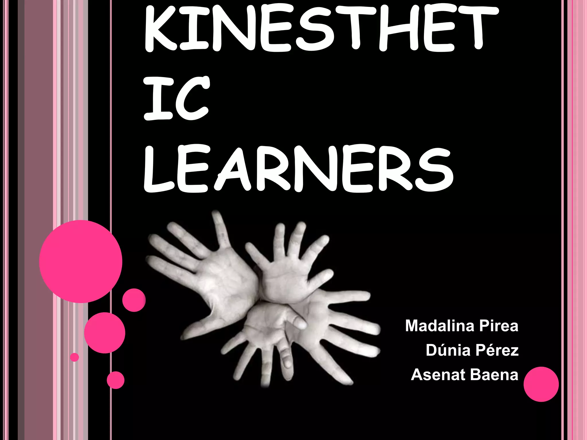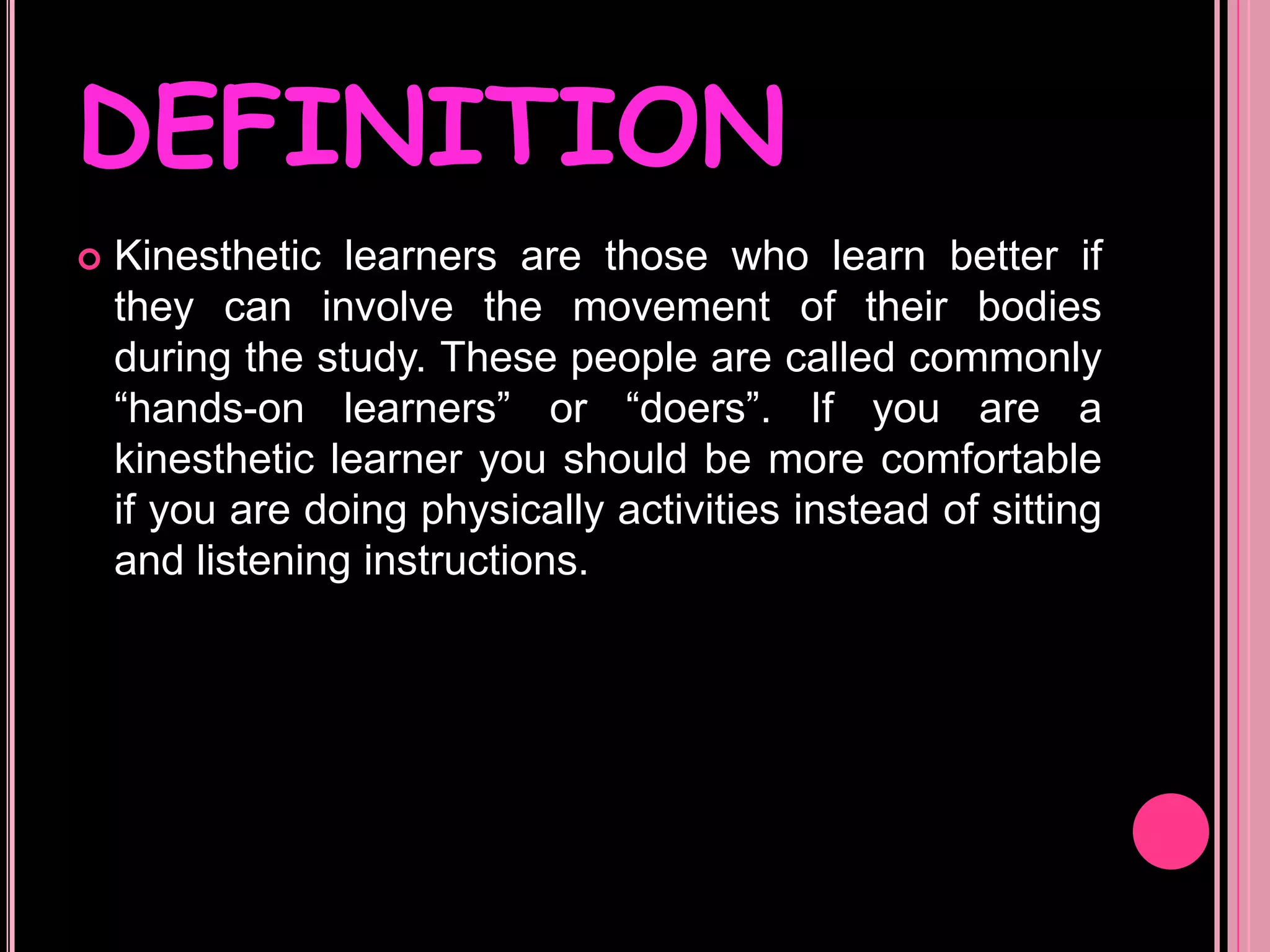 Kinesthetic learners learn best through physical movement and experience. They prefer active, hands-on learning activities over passive listening. Key characteristics include enjoying taking notes, writing things down to memorize them, doodling, touching and manipulating physical objects, dancing to music to feel the rhythm, and planning activities by making lists to stay organized.
