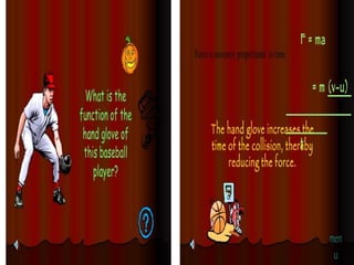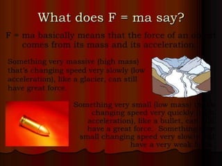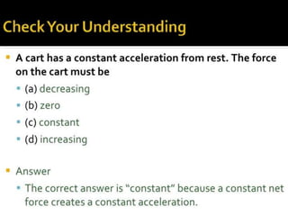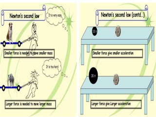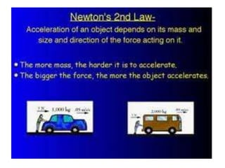 This document contains a presentation on Newton's second law of motion. The presentation topics include the relation between force, mass and acceleration, applications of Newton's second law, equations of motion, and an introduction to kinetics of particles. The document provides definitions and explanations of key concepts such as force, mass, acceleration, momentum, impulse, and kinetics. It also includes sample problems demonstrating applications of Newton's second law and equations of motion, along with step-by-step solutions. The presentation was made by Danyal Haider and Kamran Shah and covers fundamental principles of classical mechanics.