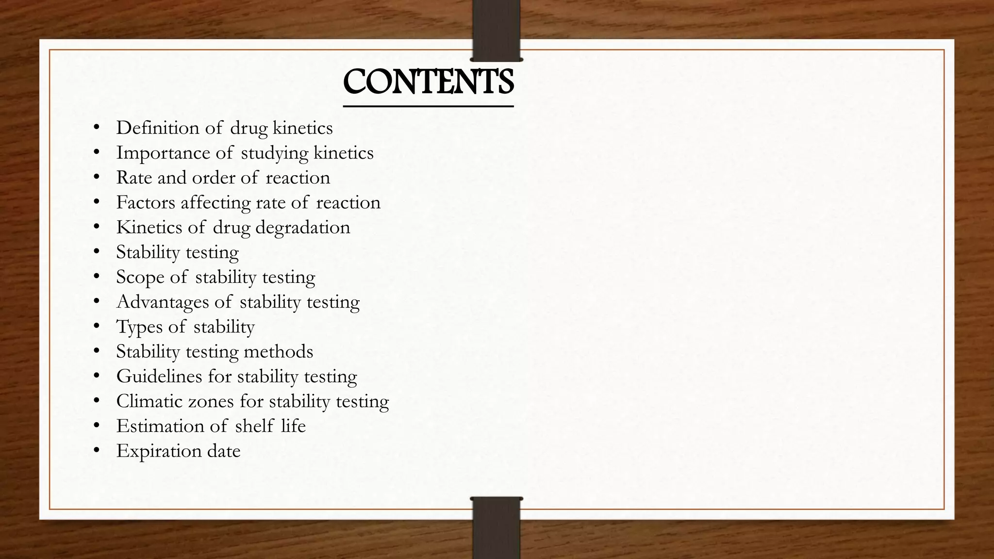 This document discusses kinetics of stability and stability testing. It defines drug kinetics as how a drug changes over time and explains zero and first order reaction kinetics. Factors affecting reaction rate and types of drug degradation are covered. Stability testing is defined and its importance, types, methods, guidelines and climatic zones are summarized. Methods for estimating shelf life and determining expiration dates are also presented.