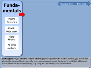 The document outlines a systematic approach to investigating reaction kinetics, starting with fundamental thermodynamics and kinetic databases, and moving on to constructing reaction networks and rate expressions. It emphasizes the importance of simple reactor models and experimental work, including parameter estimation and design of experiments to improve kinetic estimates. Finally, it discusses the challenges of translating uncertainties from kinetic models to industrial reactor performance.
