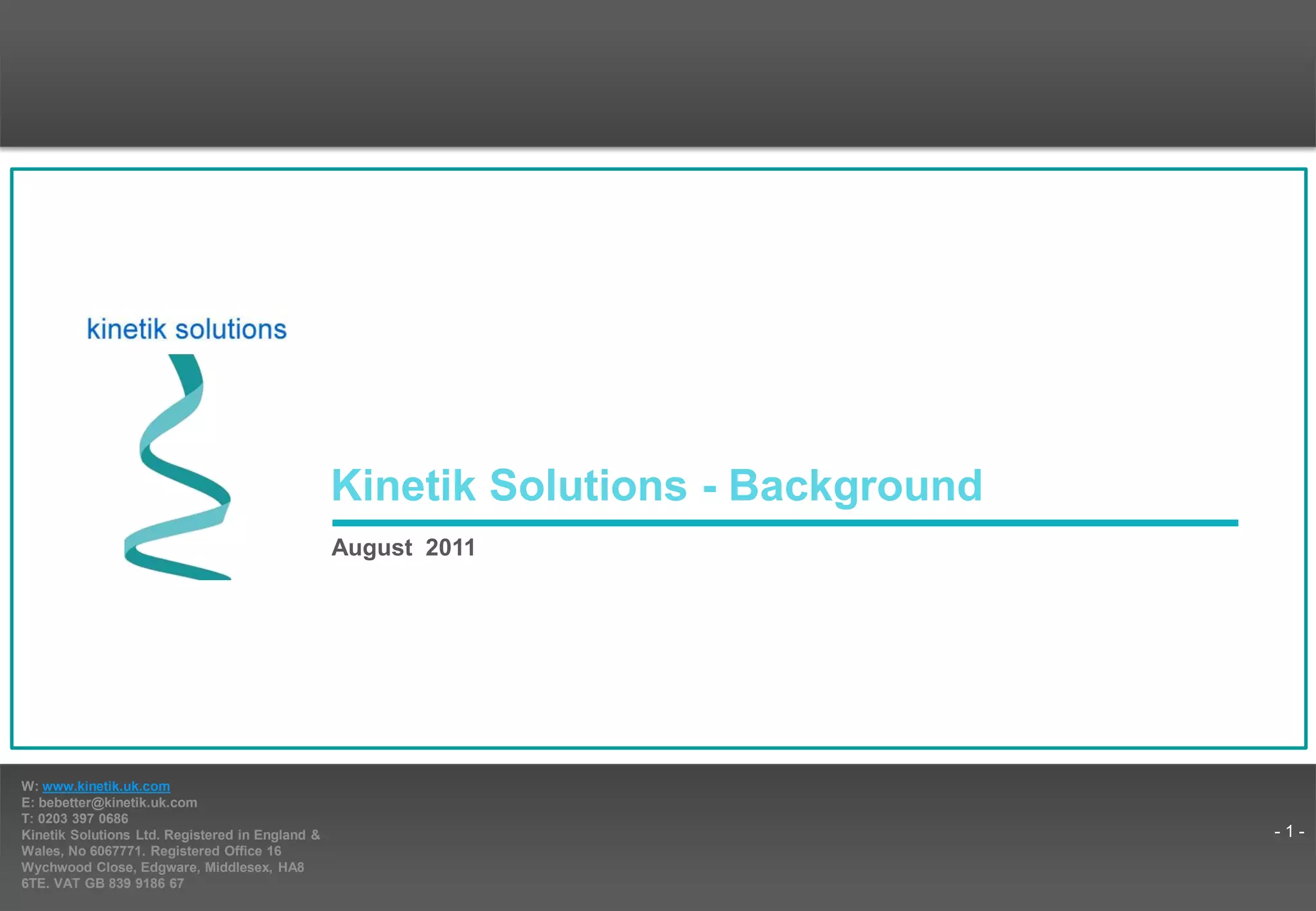 Kinetik Solutions is a UK-based consulting firm that delivers complex process change for large organizations. They have consultants with over 10 years of experience in change management, who use the most appropriate methods for client needs. Kinetik Solutions helps build sustainable change through services like operational excellence, customer needs analysis, team coaching, facilitation, data analytics, and business system implementations. They work to create trust and drive change by actively engaging staff at all levels and transferring knowledge from the start.