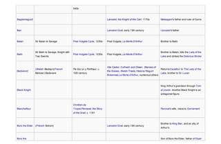 This document provides a list of characters from the Arthurian legend with brief descriptions. It includes King Arthur and members of his court like the Knights of the Round Table as well as allies and enemies. Some of the major characters mentioned are King Arthur, Guinevere, Lancelot, Merlin, Morgan le Fay, Mordred, and the knights Sir Gawain, Sir Lancelot, and Sir Galahad. There are over 50 characters listed with variations in their names across different stories and languages.