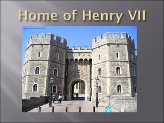 Henry VIII was born in 1491 in Greenwich, England to King Henry VII and Elizabeth of York. He became king in 1509 after the death of his older brother Arthur. Henry married Catherine of Aragon in 1509 and had one son, Henry, who died after two months. Henry sought to emulate his predecessors through war with France. He ruled England while traveling and left Cardinal Thomas Wolsey to govern in his absence. Henry had six wives and three children who became monarchs: Mary I, Elizabeth I, and Edward VI. He died in 1547 at Whitehall Palace from health problems including obesity, gout, and possibly syphilis.