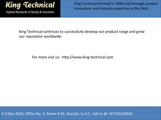 King Technical, established in 1998, specializes in product innovation within the stainless steel industry. The company offers a range of products including stainless steel pipes, butt weld fittings, round bars, and process filter housing. King Technical has built a strong global reputation and provides high-quality solutions for various markets.