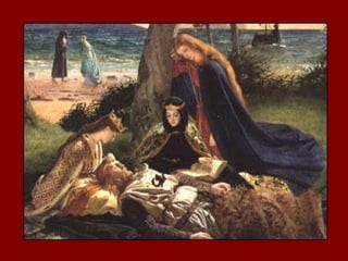 The document provides an overview of the legend of King Arthur, including the historical and literary figures of Arthur, important characters like Merlin and Guinevere, places like Camelot and Avalon, objects like Excalibur and the Holy Grail, the code of chivalry for knights, and famous works that feature the Arthurian legend.