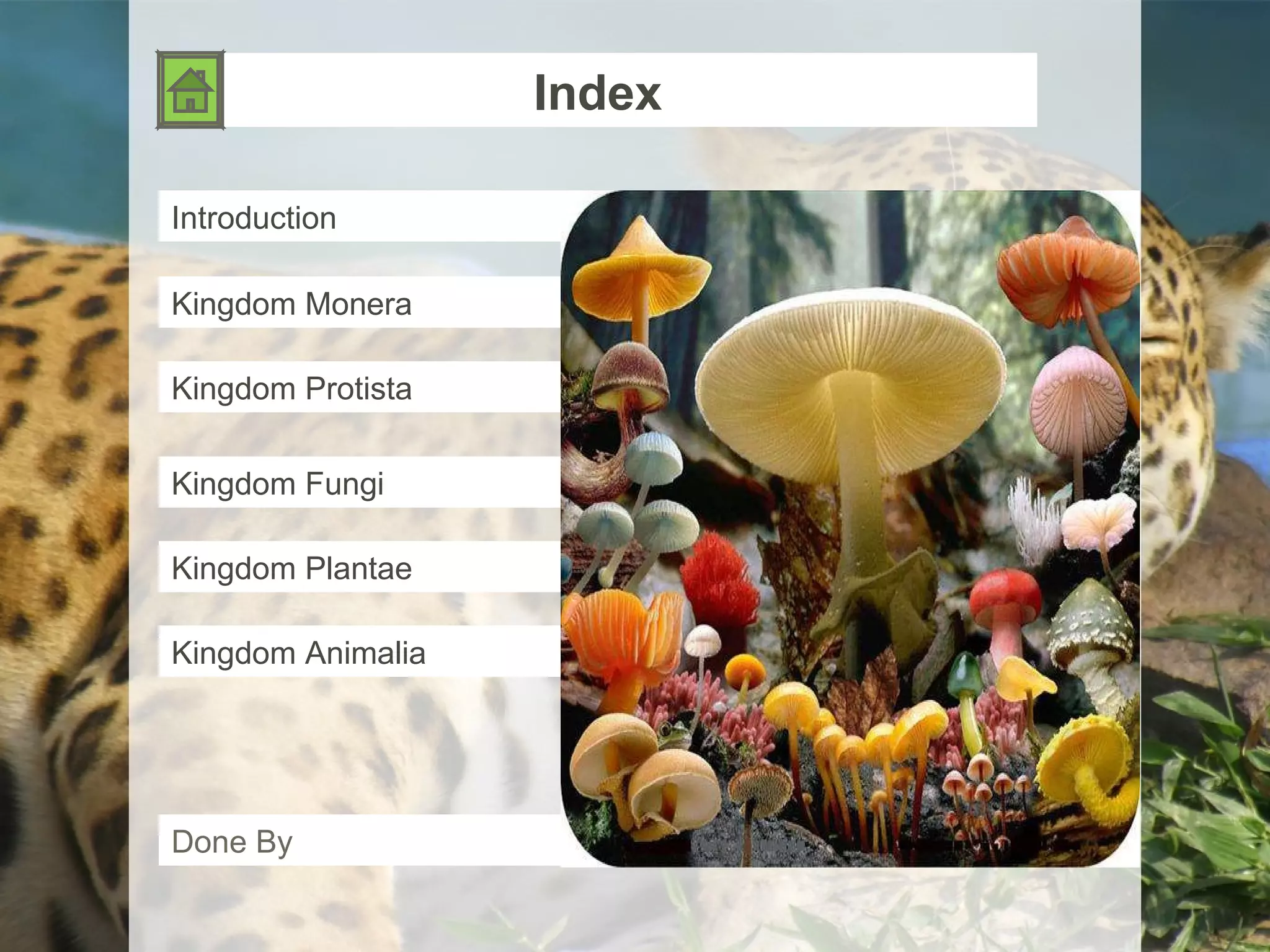 R.H. Whittaker proposed a five kingdom classification system in 1969 that categorized organisms into the kingdoms of Monera, Protista, Fungi, Plantae, and Animalia based on cell structure, organization, nutrition, reproduction, and phylogeny. Monera contained only bacteria, which are grouped by shape. Protista contained all single-celled eukaryotes and linked the other kingdoms. Fungi constituted a unique kingdom of heterotrophic organisms with diversity in morphology and habitat. Plantae included all eukaryotic, chlorophyll-containing organisms commonly called plants. Animalia was characterized by heterotrophic, multicellular eukaryotes that directly or indirectly depend