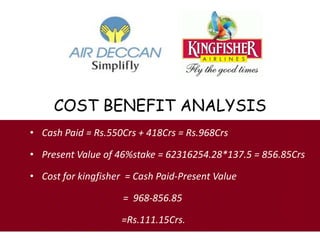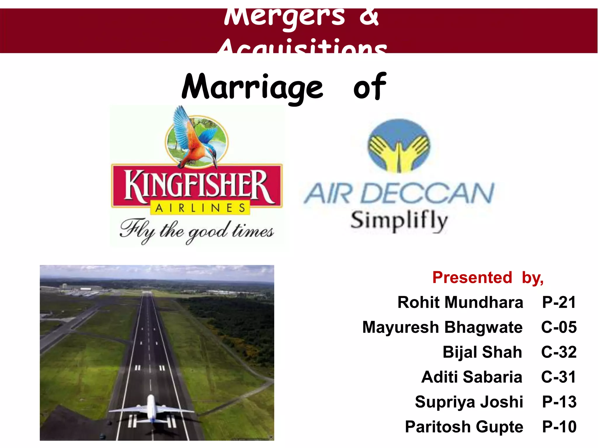 This document summarizes the merger between Kingfisher Airlines and Air Deccan in India. It discusses the key factors that led to the merger, including increasing costs, competition, and the need for consolidation in the Indian aviation industry. The merger combined Kingfisher's luxury model with Air Deccan's low-cost approach, and was aimed at achieving synergies through cost reductions, increased market share, and an expanded route network. However, integrating the two different airline cultures also posed challenges around job cuts, leadership styles, and impact on fares and employees. The aftermath section evaluates issues around market share, stake divestment, and the companies' current financial situations.
