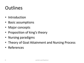 The document outlines Imogene King's goal attainment theory, emphasizing the dynamic interaction between nurse and client to mutually set and achieve health goals. Key concepts include the roles of perception, communication, and the surrounding environment in nursing practice. The nursing process, consisting of assessment, diagnosis, planning, implementation, and evaluation, is essential for achieving client-centered health outcomes.