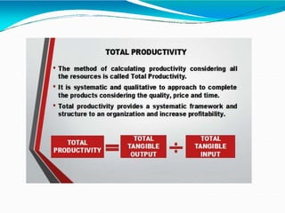 The document discusses key concepts in operations management. It defines operations management as the business function responsible for planning, coordinating, and controlling resources needed to produce products and services. An operations manager is responsible for transforming inputs like materials, labor, and capital into outputs like goods and services. The document outlines various operations management strategies, process types, facility layouts, and techniques for scheduling production, monitoring performance, and controlling processes. It also discusses ways to identify and eliminate waste, manage inventory, and increase productivity in operations.