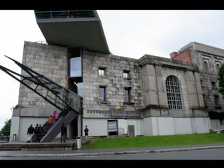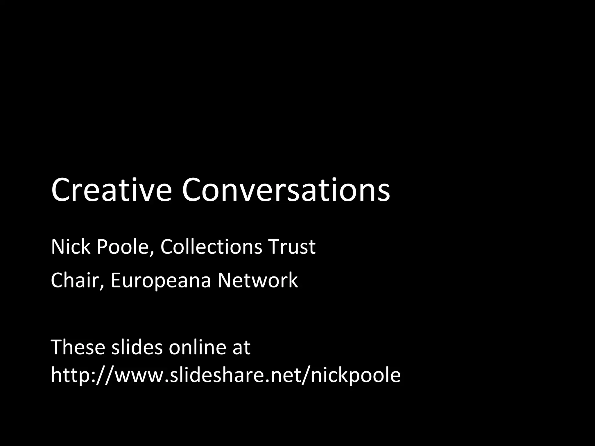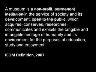 The document discusses the role of museums in storytelling and their definitions, highlighting their function as non-profit institutions that acquire, conserve, and exhibit heritage for education and enjoyment. It provides statistics about UK museums, including the number of museums, visitor statistics, and funding changes. The document promotes 'creative conversations,' inviting participation in dialogues about the challenges faced by museums.