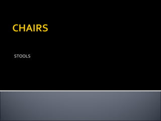The document describes different types of stools from various historical periods and regions including Egyptian, Roman, Italian, English, and 16th century styles. The stools range from basic foldable wood stools to ornate thrones made of wood like walnut and mahogany with designs featuring gold, fabrics, carvings, and enlayed features depicting animals and fleur patterns.