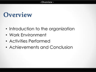 3) Key activities included preparing software requirements, studying business processes, developing models, and presenting findings to department directors. The internship provided practical experience in systems analysis, business processes, and skills like teamwork and communication.