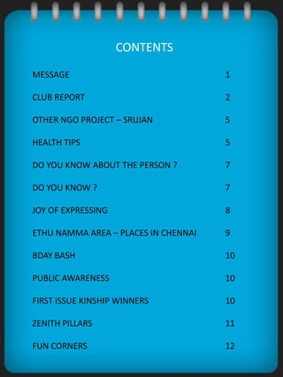 The document details the activities and accomplishments of the Rotaract Club of Zenith for the year 2014-15, including the introduction of new leadership and initiatives like the 'Enaintha Kaigal' project aimed at cancer awareness. It highlights various events, collaborations with other institutions, and community service efforts, showcasing the club's commitment to social causes and member engagement. Additionally, it reports on activities related to training, cultural events, and ongoing support for health campaigns and public awareness initiatives.