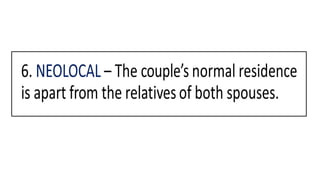 This document defines and describes different types of kinship relationships including kinship by blood, kinship by marriage, and kinship by ritual. It also defines family and different types of family structures such as nuclear family, extended family, reconstituted family, and transnational family. Finally, it discusses political kinship and how kinship relations can extend to people with political affiliations through political dynasties and alliances.