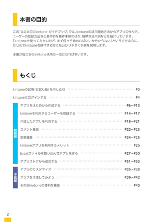 本書の目的 この「はじめてのkintone ガイドブック」では、kintoneの試用開始方法からアプリの作り方、 ユーザーの登録方法など基本的な操作手順のほか、簡単な活用例などを紹介しています。 「kintoneを使ってみたいけど、まず何から始めればいいか分からない」という方を中心に、 はじめてkintoneを操作する方にも分かりやすく手順を説明します。 本書が皆さまのkintone活用の一助になれば幸いです。 もくじ kintoneの試用(お試し版)を申し込む P3 kintoneにログインする