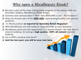 - The kiosk promises annual sales of over $600,000 and the opportunity to represent a proven natural cosmetics brand with high markups.
