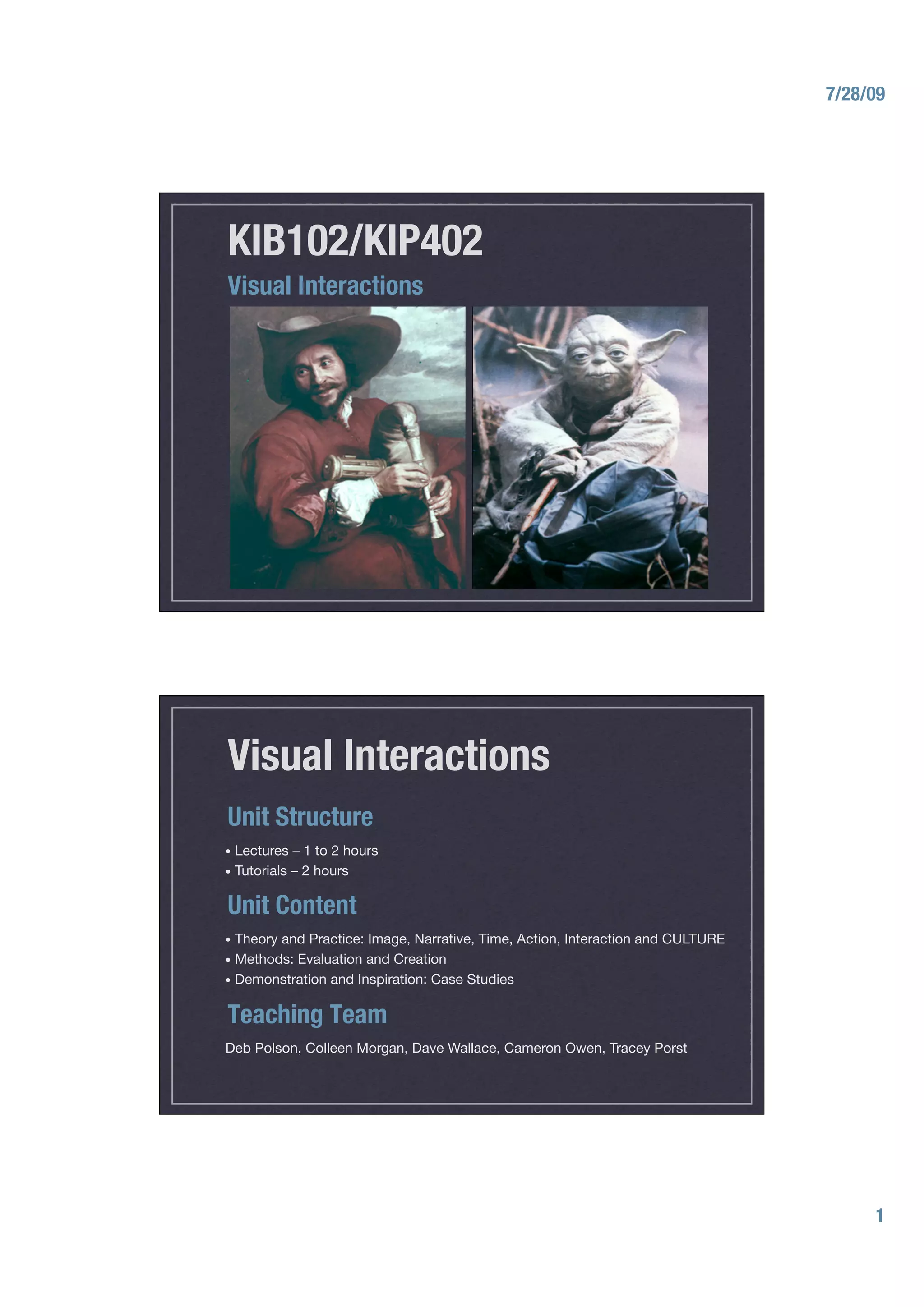 This document provides an overview of the Visual Interactions unit which includes lectures, tutorials, and case studies covering topics such as image, narrative, time, action, interaction and culture. It examines the primary elements of form in images including line, shape, texture and colour. It also discusses principles of composition and how they create dynamics like emphasis, focus, and movement. Additional sections explore content, context, interpretive models, and the interface between images and actions. Project criteria and examples are also mentioned.