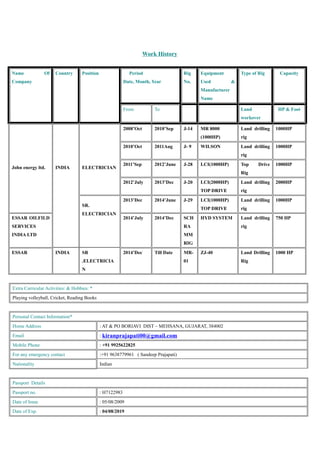Prajapati Kirankumar Kantilal is applying for the position of Senior Electrician. He has 7 years of experience as an electrician in drilling fields in India. He has worked on various land drilling rigs with horsepower capacities ranging from 750HP to 2000HP for companies like John Energy Ltd and ESSAR Oilfield Services India Ltd. He holds an ITI certification in Wireman and is competent in English, Hindi, and Gujarati languages. His hobbies include playing volleyball, cricket, and reading books.