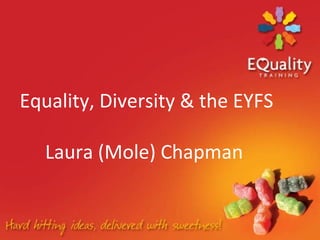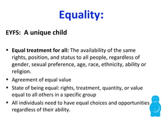 The document discusses the principles of equality and diversity in the context of the Early Years Foundation Stage (EYFS), emphasizing that all individuals should receive equal treatment and opportunities regardless of their backgrounds. It introduces concepts of equity and social justice, highlighting the importance of fairness and specific interventions to ensure equality. Additionally, it advocates for understanding and celebrating diversity within a nurturing environment.