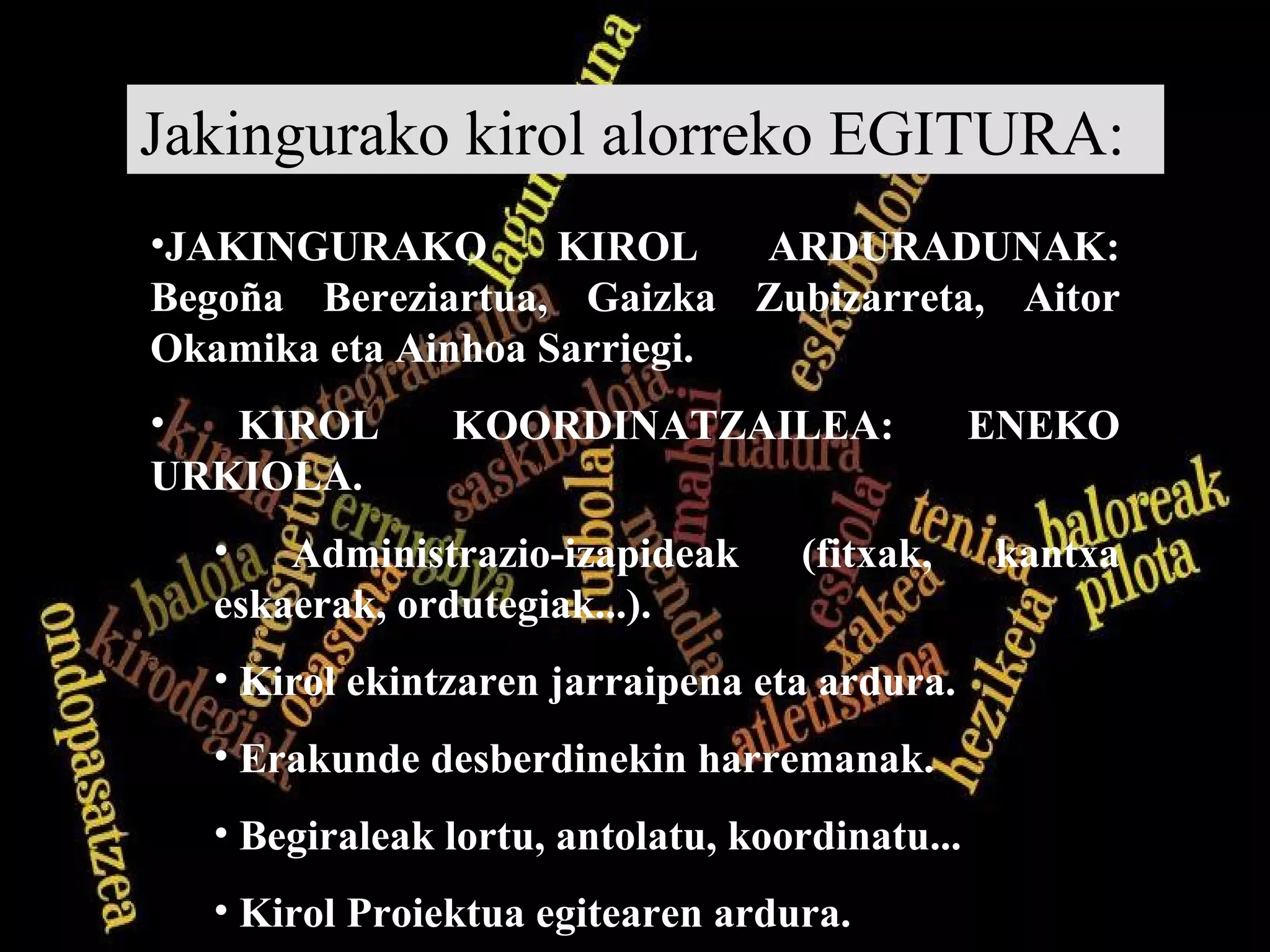 Jakingurako kirol alorrekoEGITURA: JAKINGURAKO KIROL ARDURADUNAK: Begoña Bereziartua, Gaizka Zubizarreta, Aitor Okamika eta Ainhoa Sarriegi. KIROL KOORDINATZAILEA: ENEKO URKIOLA. Administrazio-izapideak (fitxak, kantxa eskaerak, ordutegiak...). Kirol ekintzaren jarraipena eta ardura. Erakunde desberdinekin harremanak. Begiraleak lortu, antolatu, koordinatu... Kirol Proiektua egitearen ardura.