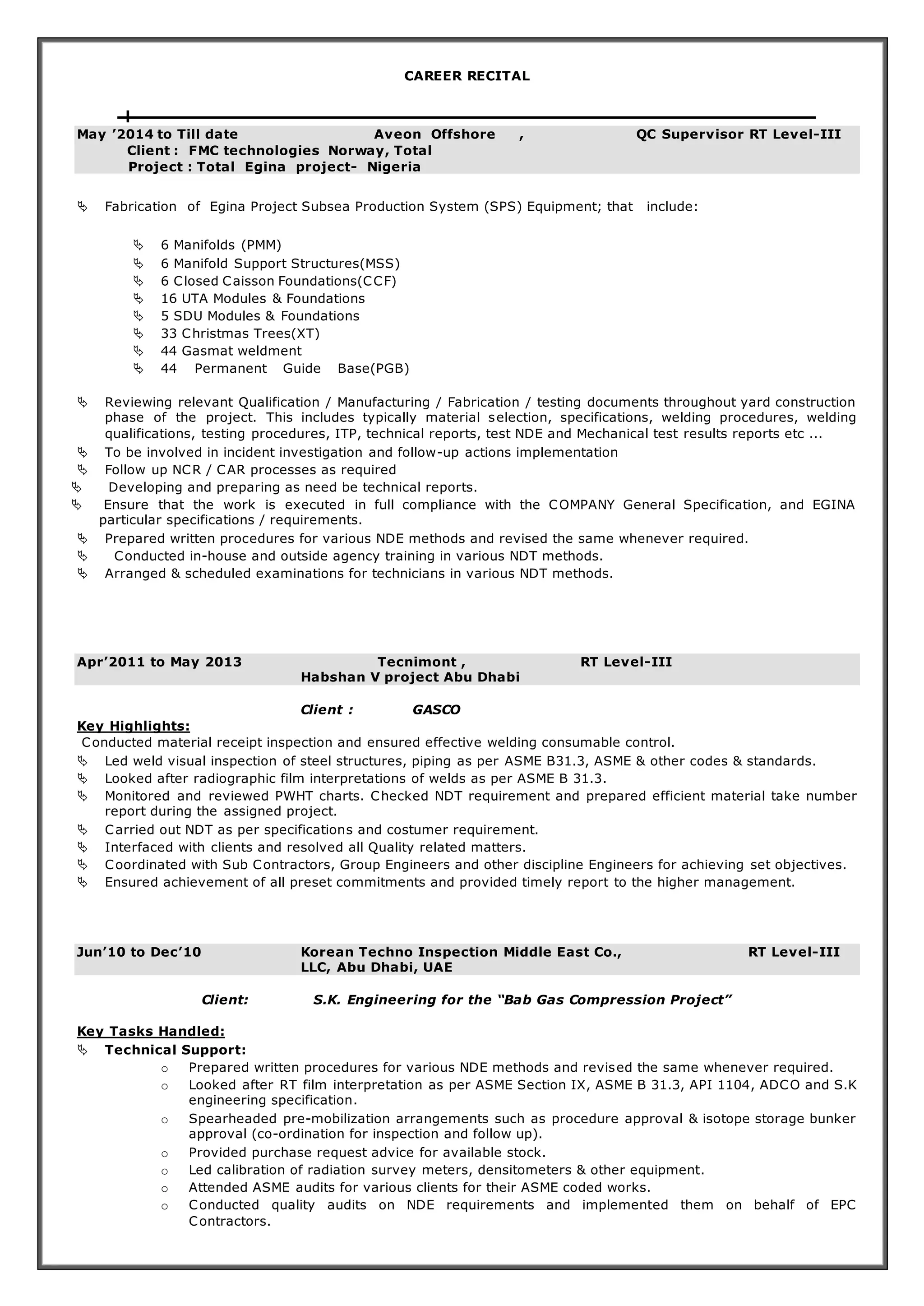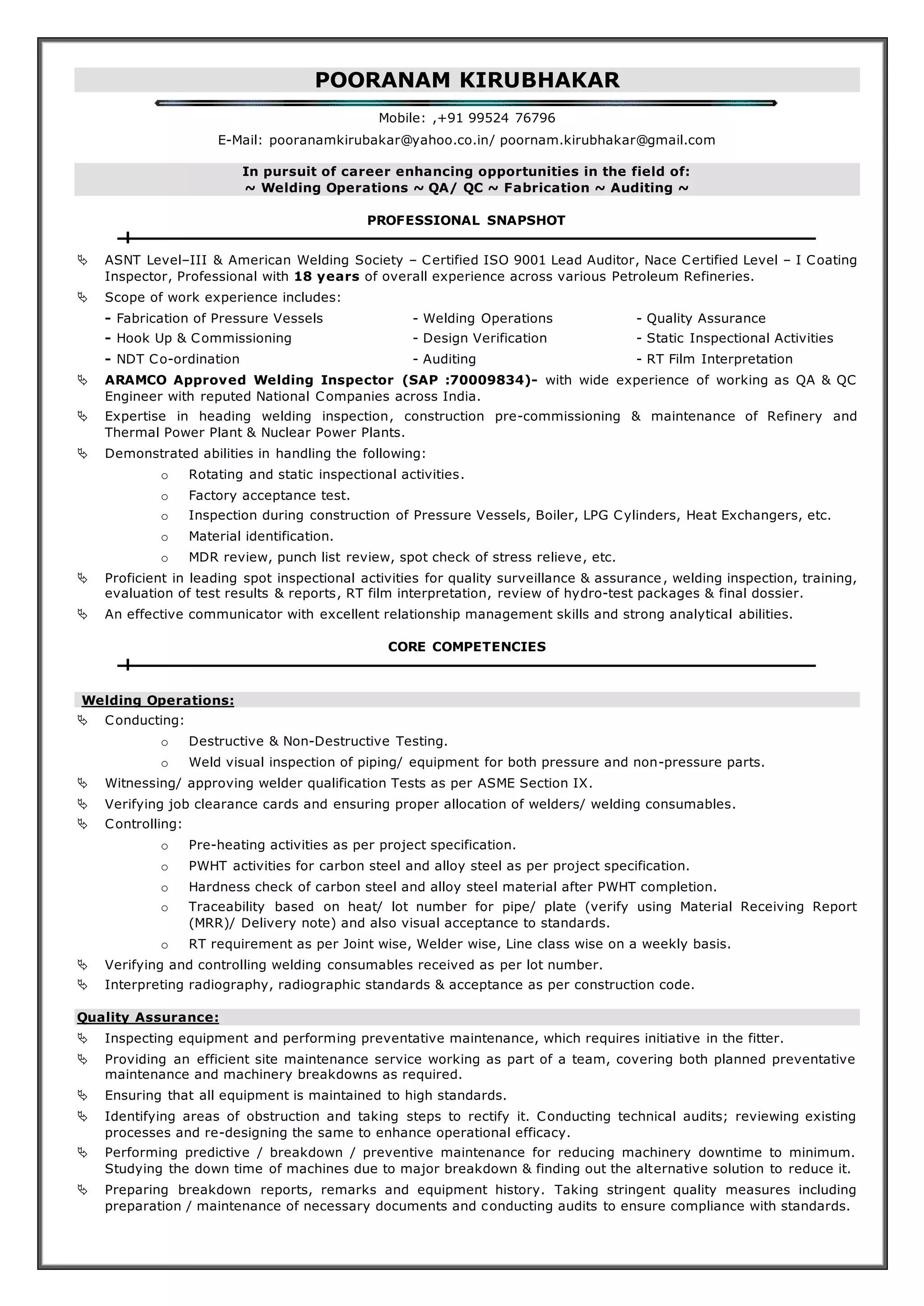 This document provides a summary of Pooranam Kirubhakar's professional experience and qualifications. He has over 18 years of experience in quality assurance, welding inspection, and fabrication across various petroleum refineries. He holds several certifications including ASNT Level-III, AWS certified ISO 9001 Lead Auditor, and Nace Certified Level-I Coating Inspector. His experience includes roles as a QA/QC engineer, welding inspector, and RT Level-III technician for numerous projects in India, the Middle East, and Africa.