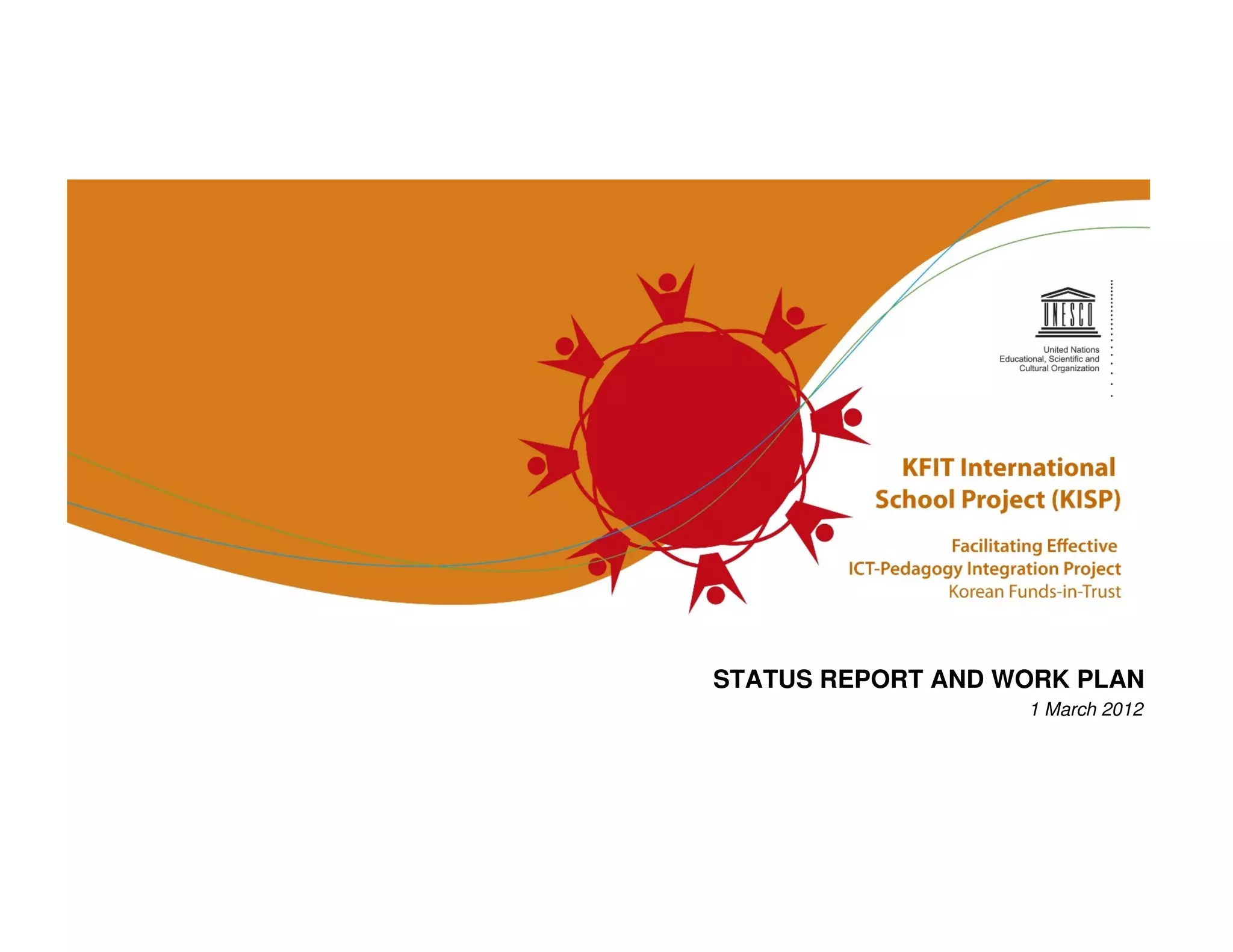 The document provides a status report and revised work plan for the KFIT International School Project (KISP). Key points include: