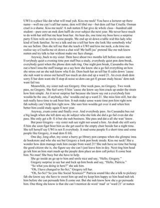 Gregory was a student at the University of the West Indies (UWI) who also worked nights at the telephone company call center with the narrator's sister. When Gregory disappeared for weeks without explanation, the sister assumed he had a breakdown and been committed to the psychiatric ward. She later discovers that Gregory had merely been on approved study leave the whole time. Mortified at having mistakenly tried to commit Gregory herself, the sister now avoids him in embarrassment. This story highlights the thin line between sanity and madness.