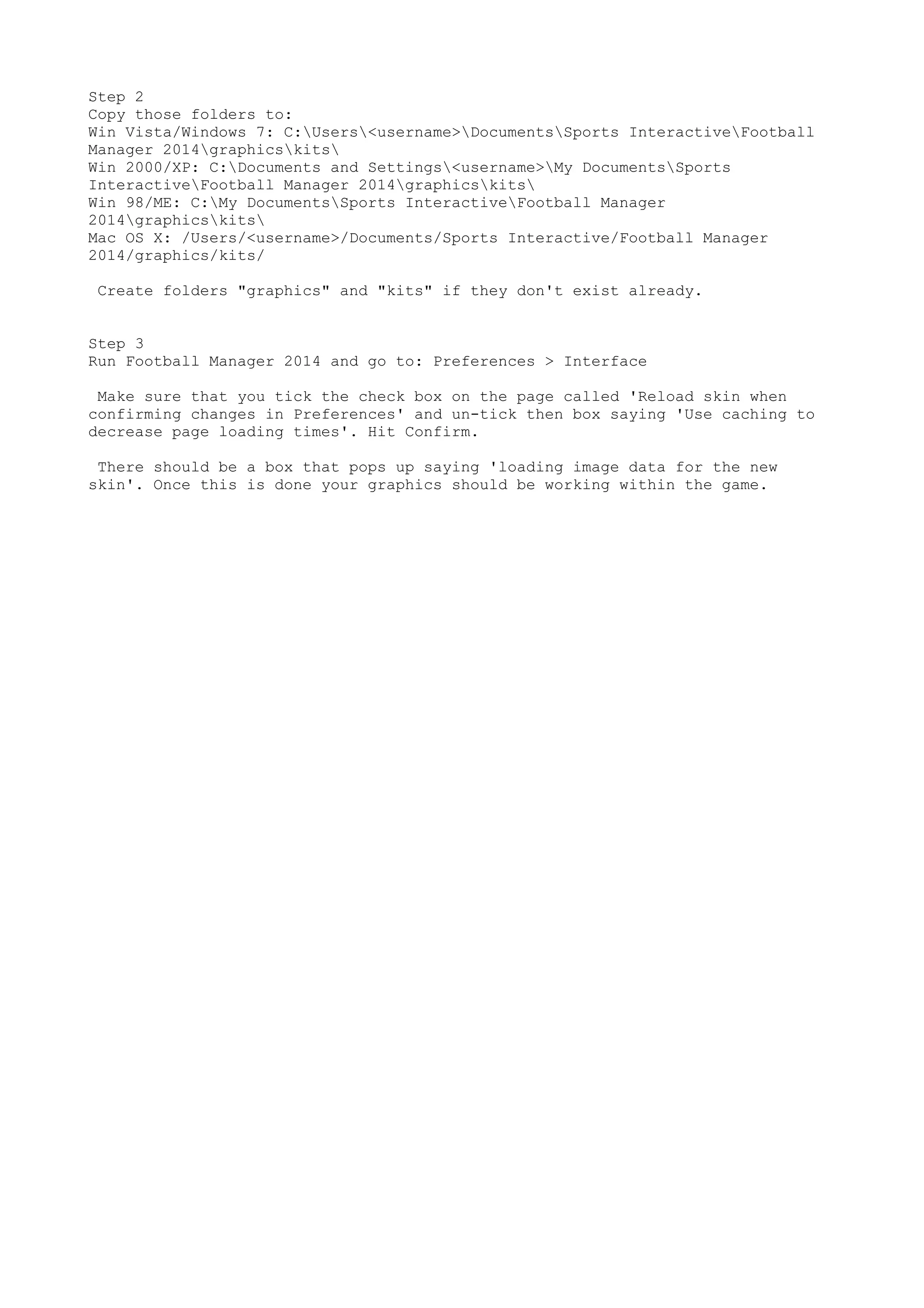 Copy folder containing team kits graphics to specified location under Documents folder for your operating system, creating any nonexistent folders, then in Football Manager 2014 preferences, select the option to reload skin when confirming changes and disable caching to load the new graphics in-game.