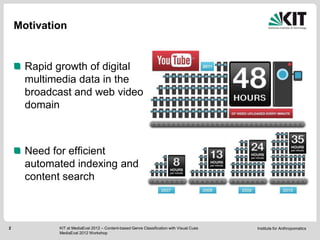 The document discusses KIT's system for content-based genre classification of videos using visual cues. The system extracts low-level visual features from keyframes and classifies videos using SVMs. It then fuses the results using majority voting. The system achieves better performance when incorporating prior domain knowledge about the distribution of genres in the development set. Future work could explore temporal features, mid-level semantics, and integrating other modalities like audio and metadata.