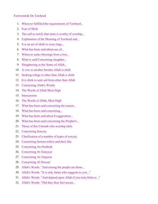 The document, titled 'Kitaab at-Tawheed' by Sheikh Imam Muhammad Abdul-Wahhaab, addresses the concept of Tawheed (the oneness of Allah) and discusses various related topics such as the fear of shirk (associating partners with Allah), the significance of worshipping Allah alone, and the obligations towards parents and society. It emphasizes the importance of rejecting all false deities and the importance of sincere worship, alongside moral conduct in social relationships, like kindness to orphans, neighbors, and the needy. The translation is intended to assist English speakers in understanding these fundamental Islamic teachings better.