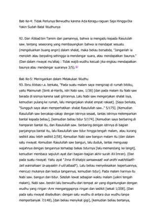 Bab pertama membahas tentang wajibnya wudhu menurut ayat Al-Maidah 6 dan penjelasan Nabi saw. tentang melakukan wudhu satu, dua, atau tiga kali. Bab-bab berikutnya membahas tentang kewajiban wudhu untuk shalat, keutamaan wudhu, dan berbagai hal terkait tata cara melakukan wudhu menurut sunnah Nabi saw. seperti cara membasuh muka, masuk toilet, dan lain sebagainya.