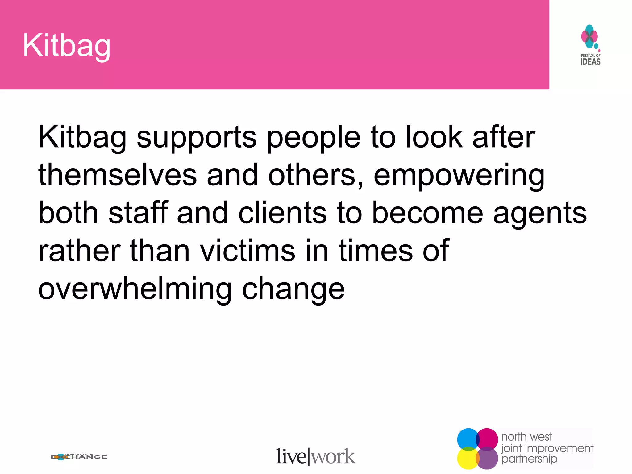 Kitbag is a resource designed to empower individuals and organizations to foster self-care and resilience amid challenging circumstances. It provides tools for personal and community growth, emphasizing mutual respect and reducing reliance on professional help. By promoting individual meaning and hope, Kitbag enhances service delivery and supports social change in various settings.