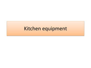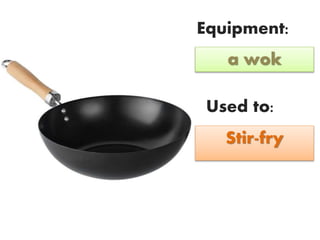 The document lists various pieces of kitchen equipment and their uses, including a wok for stir-frying, a steamer for steaming, a deep fat fryer for deep-frying, a casserole for stewing, a food processor for chopping, slicing and mixing, a whisk for beating, a colander for draining, a grater for grating, a garlic crusher for crushing, a sieve for sieving, a peeler for peeling, a lemon squeezer for squeezing, a corkscrew for opening, a ladle for serving, and kitchen scales for weighing.